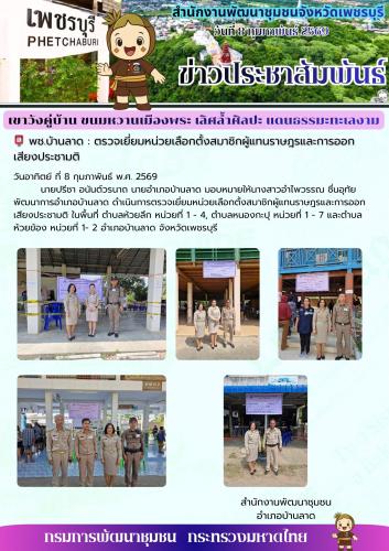 นายปรีชา อนันต์วรนาถ นายอำเภอบ้านลาด มอบหมายให้นางสาวอำไพวรรณ ชื่นอุทัย พัฒนาการอำเภอบ้านลาด ดำเนินการตรวจเยี่ยมหน่วยเลือกตั้งสมาชิกผู้แทนราษฎรและการออกเสียงประชามติ ในพื้นที่ ตำบลห้วยลึก หน่วยที่ 1 - 4, ตำบลหนองกะปุ หน่วยที่ 1 - 7 และตำบลห้วยข้อง หน่วยที่ 1- 2 อำเภอบ้านลาด จังหวัดเพชรบุรี