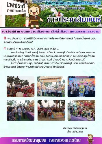 นางวันเพ็ญ มังศรี รองผู้ว่าราชการจังหวัดเพชรบุรี เป็นประธานเปิดงานเทศกาลประเพณีสงกรานต์ "มรดกถ้ำรงค์ ตอน สงกรานต์บนหลังเกวียน" ณ บริเวณทุ่งถ้ำรงค์ (ตรงข้ามที่ว่าการอำเภอบ้านลาด) ตำบลถ้ำรงค์ อำเภอบ้านลาดจังหวัดเพชรบุรี